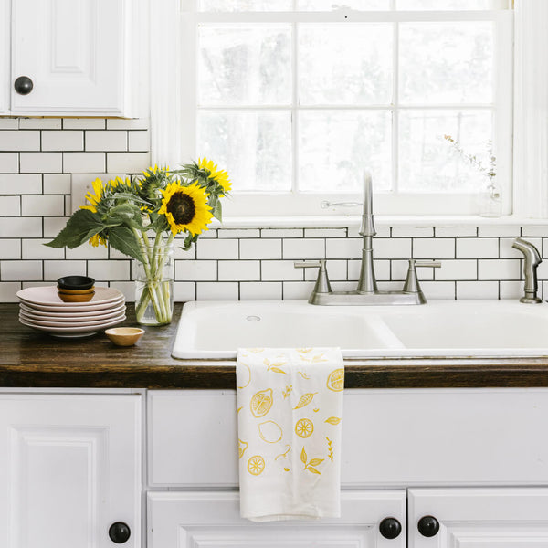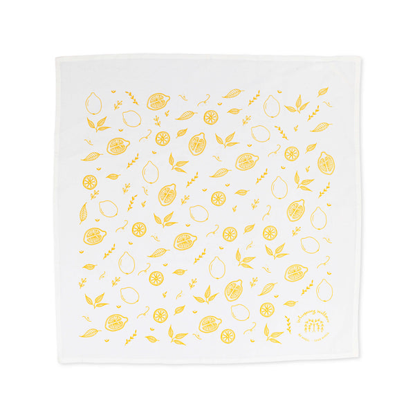 A hand drawn lemon and citrus pattern designed by artist Joanna Dee is screen printed in sunshine yellow on a generously sized flour sack towel making for a simple, elegant solution for so many kitchen duties.